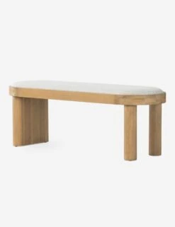 Architectural lines and rounded edges offer this ash wood bench a soft, rustic appeal. With its artisan-inspired joinery and upholstered seat, this bench provides a dynamic element for your entryway, living space, or at the end of your bed with inviting textural appeal.
