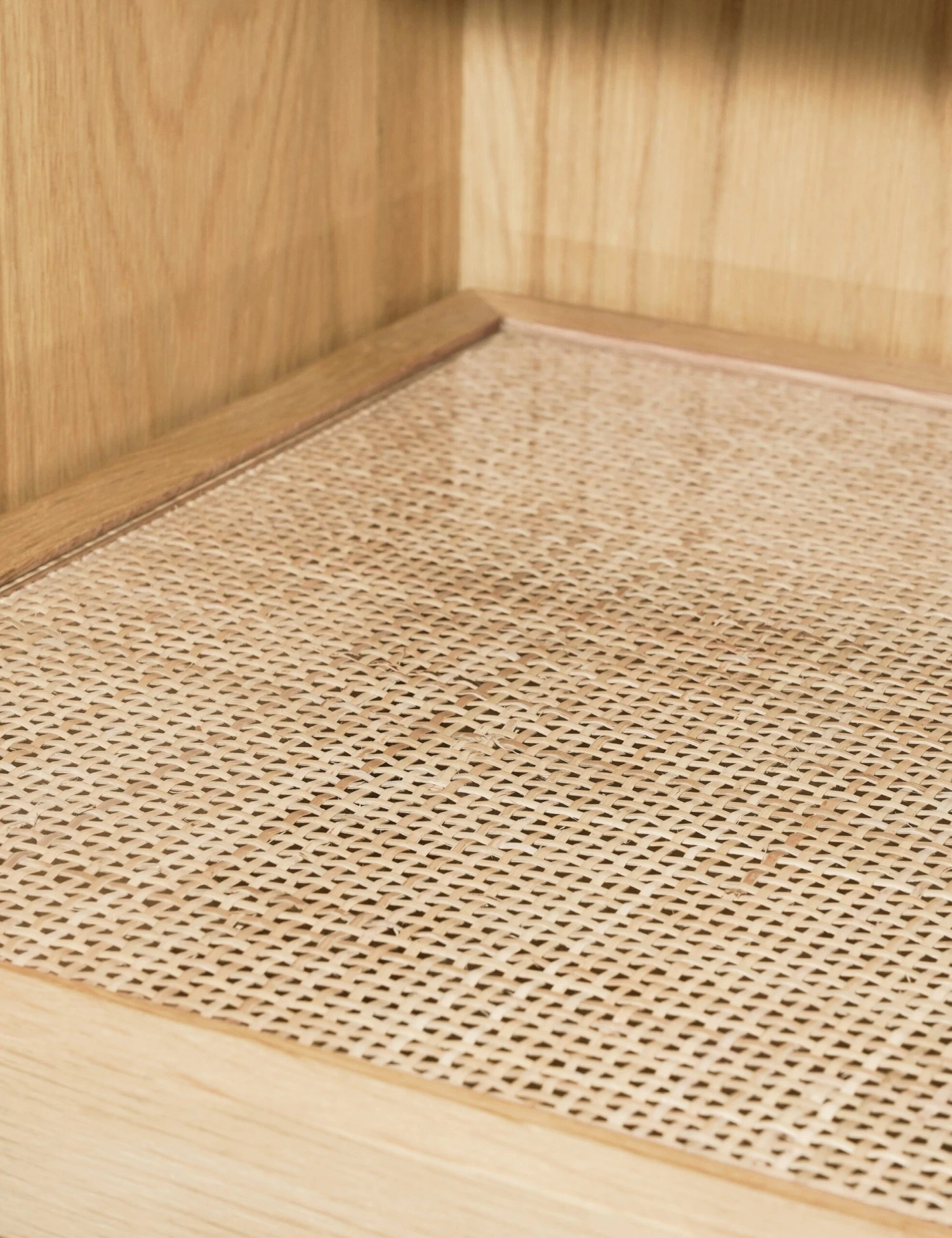 A timeless cabinet with a solid oak frame and natural cane shelving that offers a warm, modern tone to your living room or entryway. This small cabinet provides the perfect touch of storage for small-space style with glass panel doors for display.