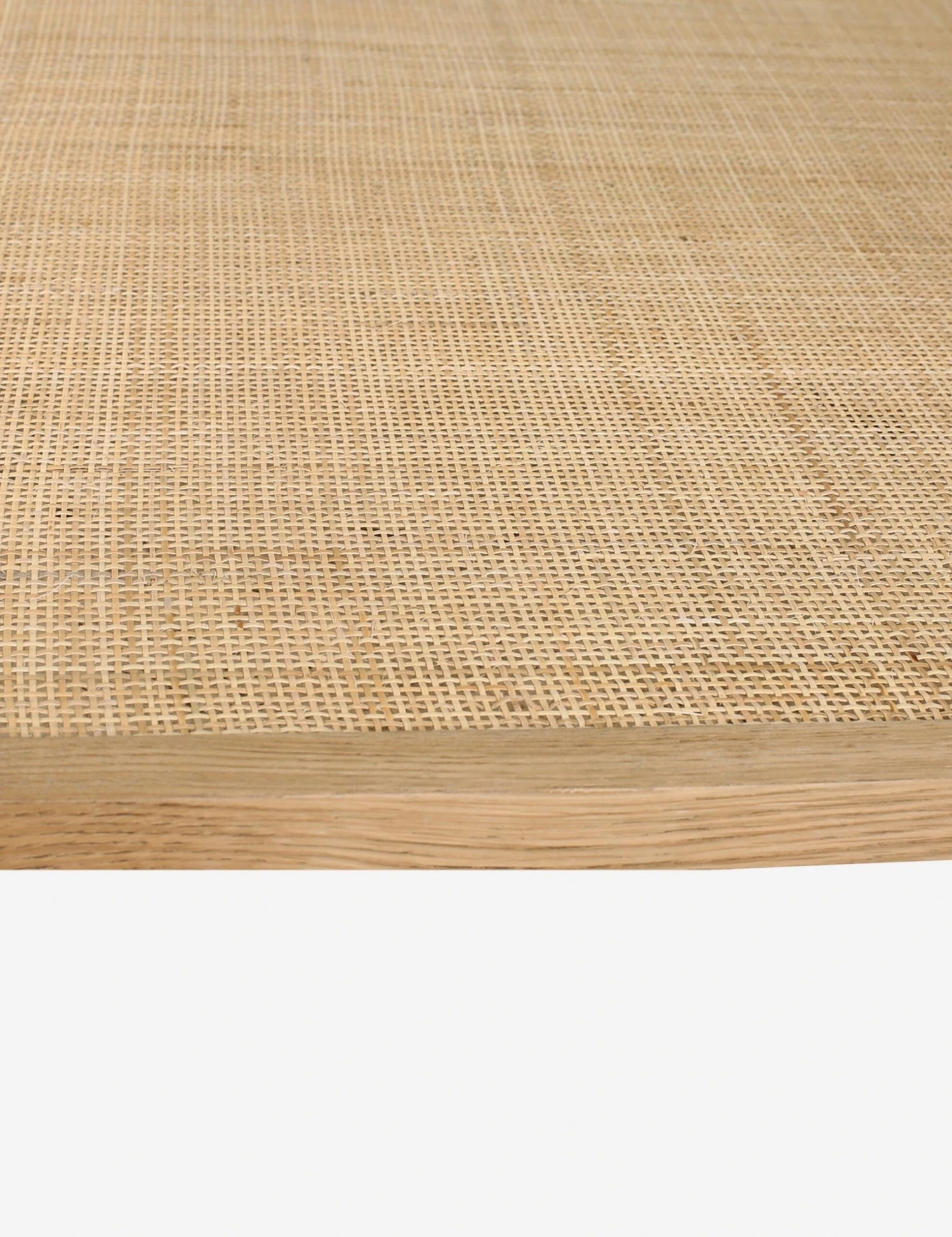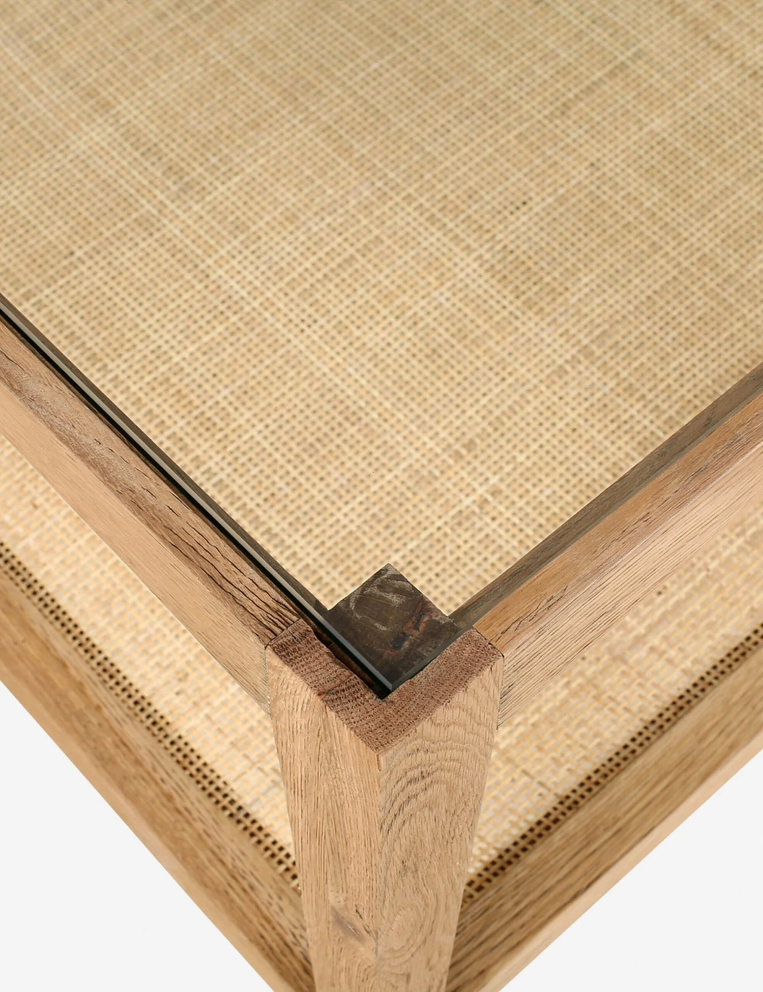 A timeless square coffee table made with a solid oak frame, natural cane shelf, and tempered glass top that offers a warm, modern tone to a living room. This versatile coffee table is just as suited to a few thoughtfully chosen pieces of refined décor as it is to a casual array of drinks and coffee table books.