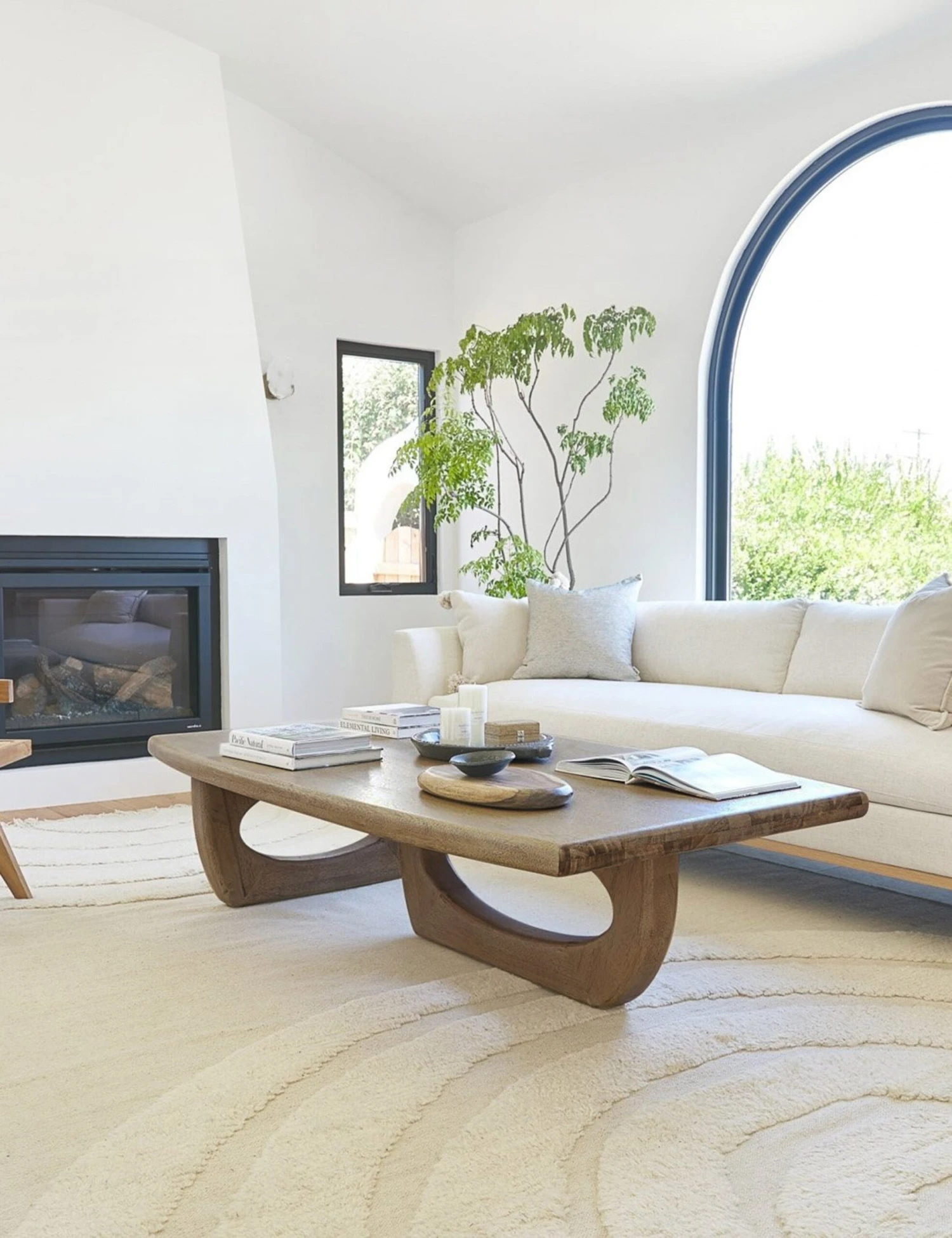 A contemporary bleached walnut coffee table gets a retro vibe thanks to cutout ovals on the legs and its smooth, curved edges.