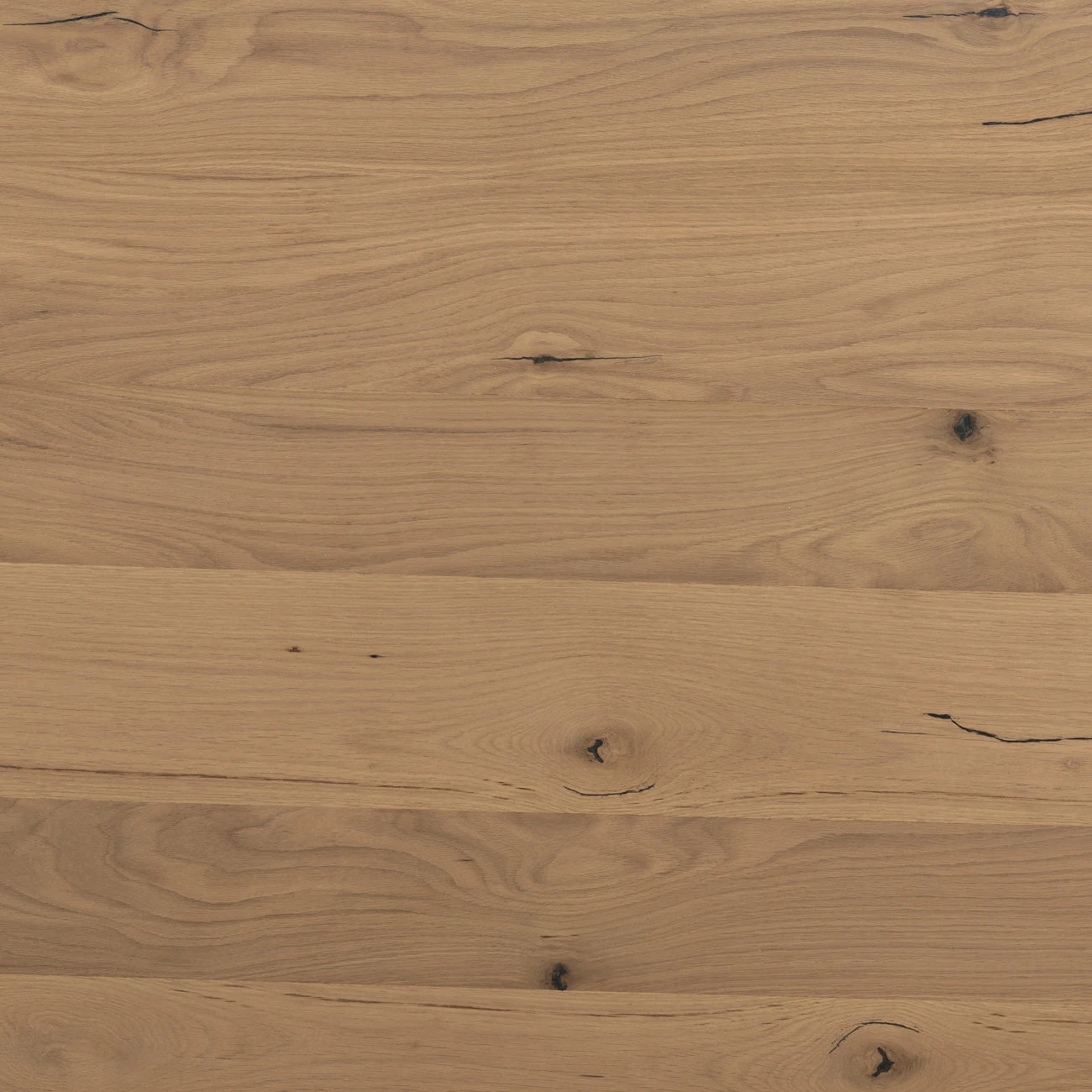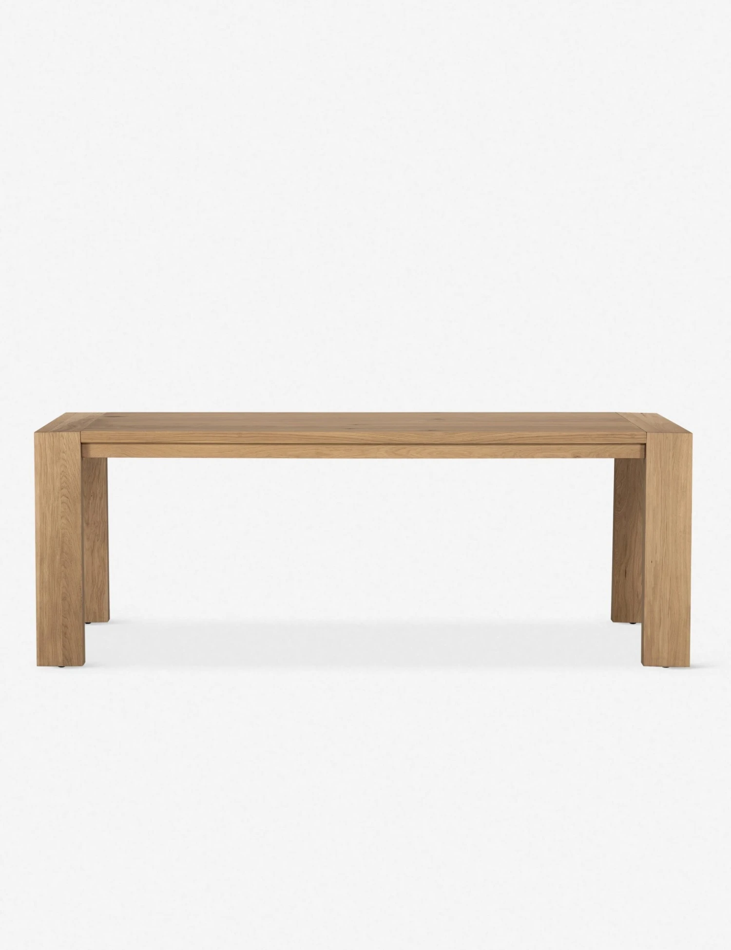 A classic rectangular dining table, reimagined with stunning details that highlight the organic appeal of the oak woodgrain. This wood kitchen table features a paneled top, with sturdy legs that splay out at a subtle angle.