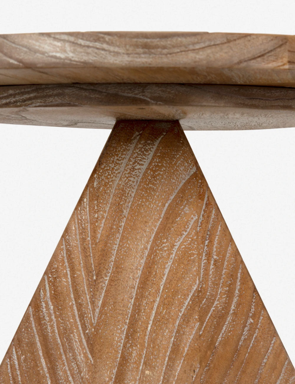 Stacked shapes carved from mindi wood ground this sculptural side table with a natural balance. A light wash finish highlights the beautiful natural grain, offering an ideal pedestal for organic decor or an eye-catching end table with a stylish edge.
