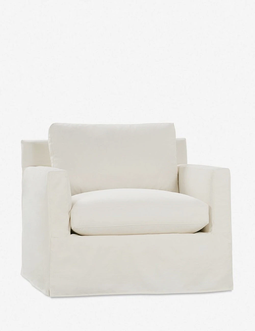 This neutral chair slipcover is the perfect way to dress up your living room. Ideal for traditional and transitional spaces, finish the look with pretty patterned pillows and vintage wood accents.
