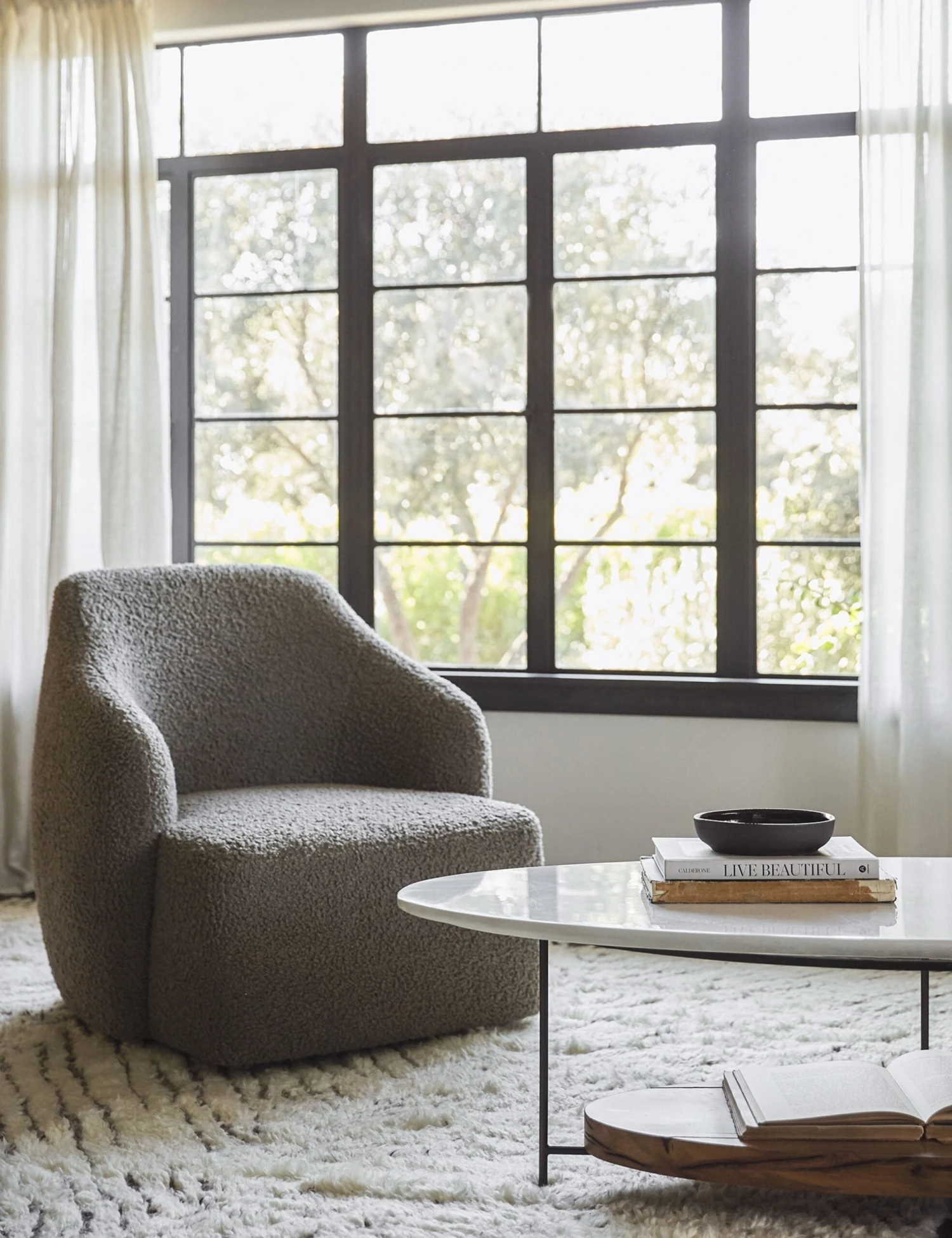 This versatile swivel accent chair with a fun boucle texture adds dimension to your space. The curved frame makes this the perfect decorative chair for living rooms with a transitional style.