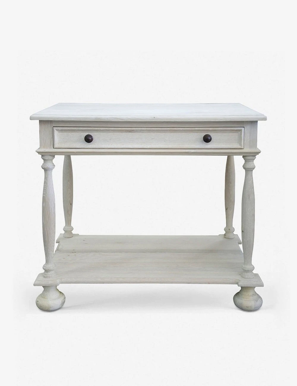 Rounded feet and turned spindle legs give this nightstand a chic and sophisticated feel, while the washed oak finish and iron knobs both exude effortless style. In addition to the shallow drawer, a lower shelf provides added open storage to maximize space in a smaller bedroom.